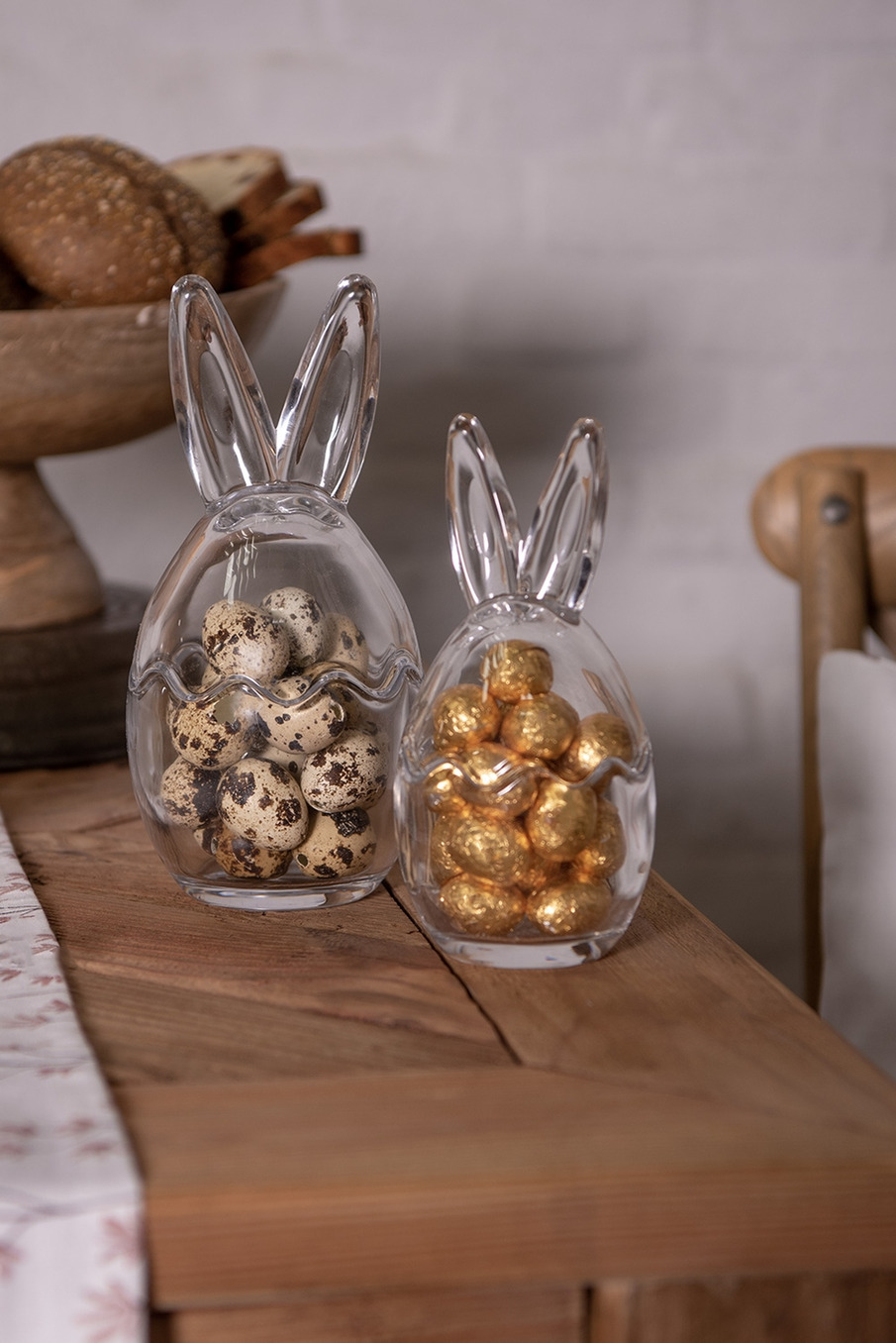 Glasburk med lock i form av kaninöron som passar perfekt till påskens dekorationer. Det klara glaset gör att innehållet syns fint, vilket gör den perfekt för små chokladägg, godis eller andra små favoriter. En enkel och charmig detalj som passar fint på bordet, i fönstret eller som en del av en påskdukning.