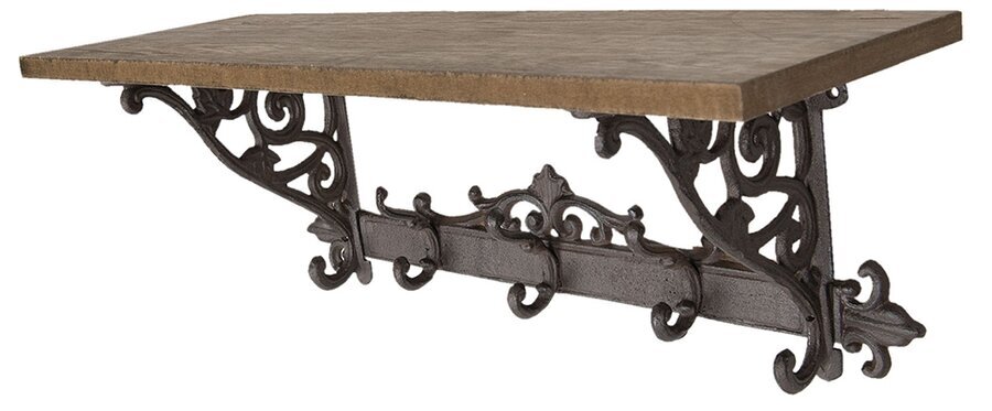 Elegant hylla i gjutjärn och trä som kombinerar klassisk design med funktionalitet. Perfekt för att visa upp dekorationer, böcker eller växter. Hyllan kan även användas som klädhängare eller praktisk hallförvaring för kappor och väskor, vilket gör den till en mångsidig och stilfull lösning för ditt hem.