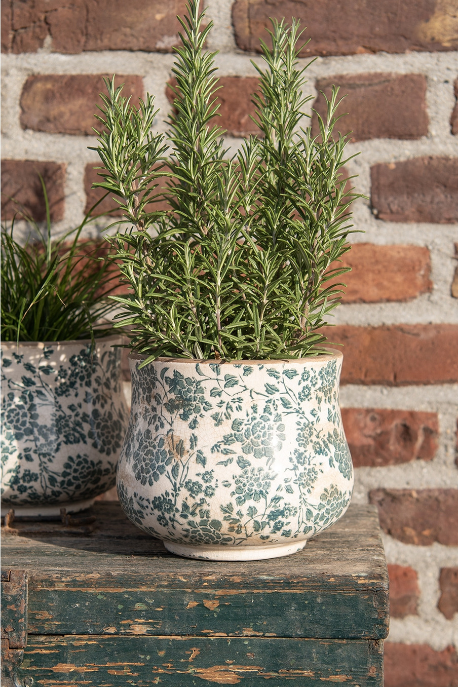 En dekorativ kruka med tidlös charm och romantisk känsla. Det vackra blommönstret i dämpade gröna toner mot den ljusa botten ger krukan ett mjukt och elegant uttryck som för tankarna till klassiska trädgårdar och lantlig elegans. Den rundade formen förstärker det harmoniska intrycket och gör krukan till en vacker detalj i såväl kök som vardagsrum, uterum eller växthus.