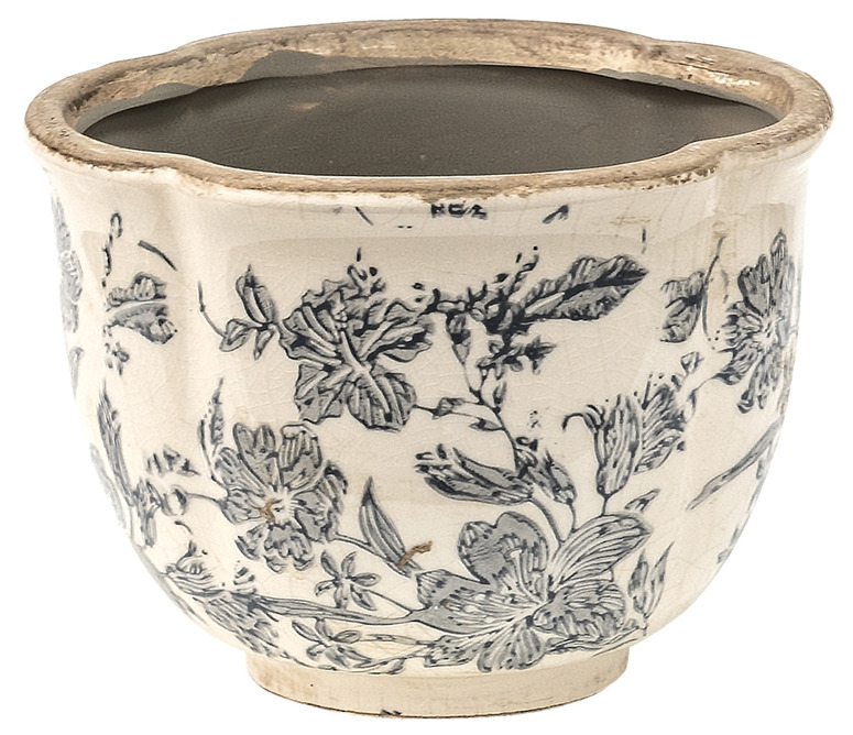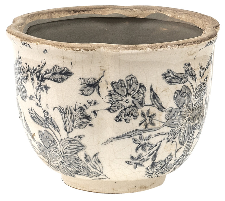 En dekorativ kruka med mjukt romantisk känsla och tidlös elegans. Det vackra blommönstret i dämpade grå toner mot den ljusa botten ger krukan ett klassiskt och harmoniskt uttryck som för tankarna till äldre porslin och charmiga trädgårdsmiljöer. Den mjukt rundade formen och den vågiga kanten upptill tillför en extra detaljrikedom som gör krukan både levande och sofistikerad.