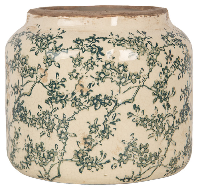 En dekorativ kruka med mjuk romantik och tidlös elegans. Det detaljrika mönstret av blommande grenar i dämpade gröna toner mot den varma, ljusa botten ger krukan ett harmoniskt och sofistikerat uttryck. Den rundade formen tillsammans med den lätt antika finishen skapar en vacker balans mellan klassisk charm och lantlig lyx.