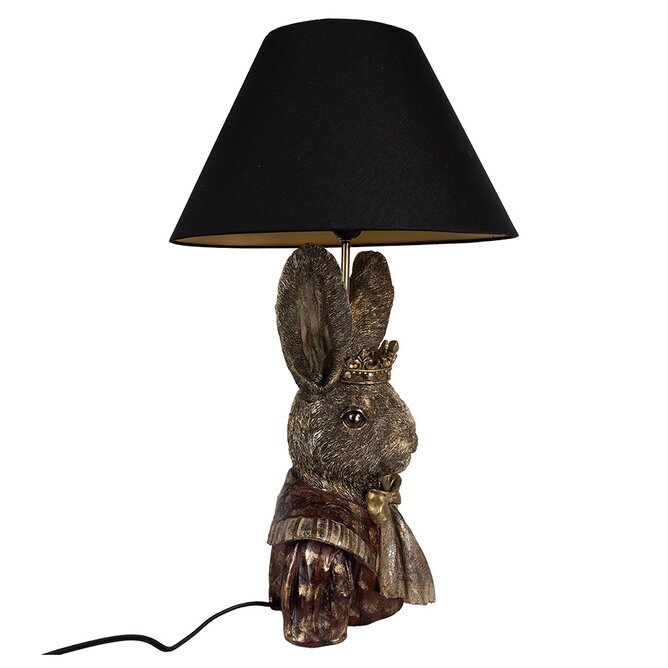 Låt denna unika lampa bli kronan på verket i din inredning! Med sin eleganta antika finish, detaljerade kaninform och majestätiska krona kombinerar den lyx och lekfullhet på ett perfekt sätt. Den svarta lampskärmen skapar en stilfull kontrast och sprider ett behagligt ljus som passar både i vardagsrummet, sovrummet eller på ett sidobord.