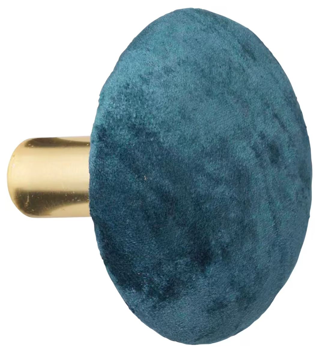 Knoppen har en rund profil och erbjuder ett stilrent uttryck som passar väl in i många olika inredningsstilar. Dess släta yta ger en taktil upplevelse och bidrar till en känsla av komfort och elegans. Det petrolfärgade sammetet har en djup konsistens som ger dimension och en känsla av värme i rummet den placeras i.