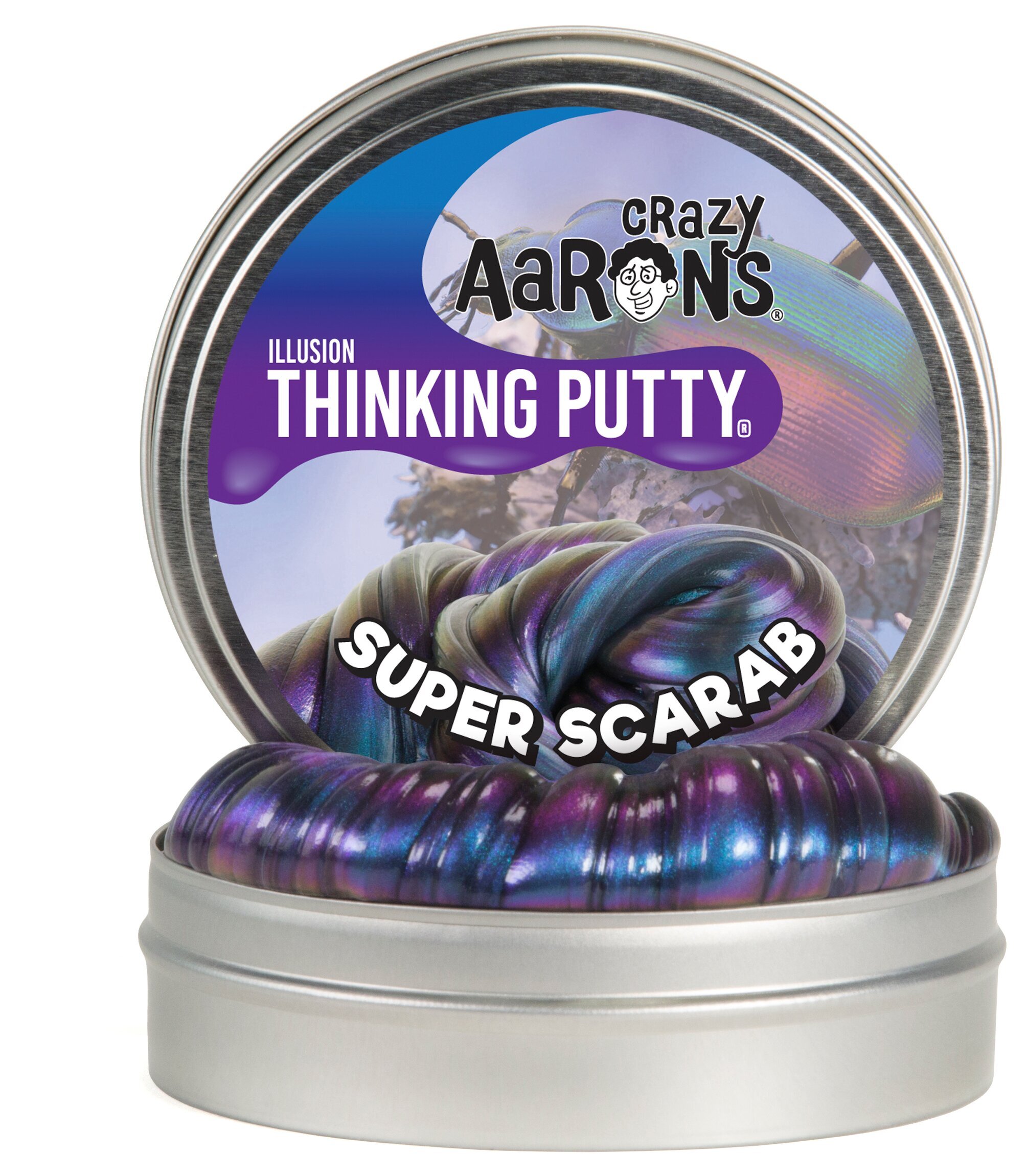 Burken har ett lock med en cirkulär etikett, där varumärkesnamnet Crazy Aarons Thinking Putty är tydligt framträdande. Etiketten har en blå-lila gradientbakgrund som smälter ihop med en bild av en skalbagge i bakgrunden, vilket knyter an till namnet Super Scarab. Ordet "Illusion" är också tryckt på etiketten, vilket antyder produktens förmåga att skapa visuellt slående effekter.