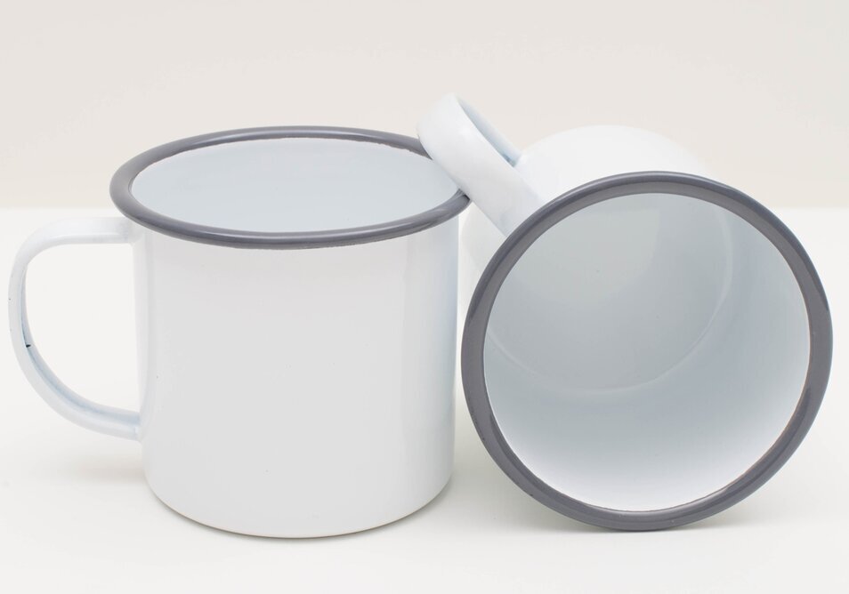 Tidlös & stilren emalj-mugg, vit med grå kant. Muggen är tillverkad utav högkvalitativ stål som sedan är belagd med två lager av porslinsemalj. Rymmer ca 3,5 dl. Finns i flera olika färger samt mönster. OBS - Priset avser en mugg.