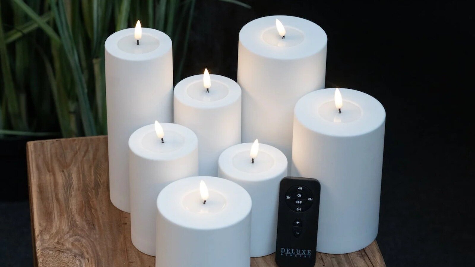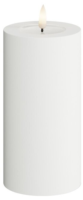 Blockljus LED för utomhusbruk i en fin vit nyans. LED-ljuset har en patenterad 3D Real Flame låga som ger ett verklighetstroget utseende. Ljusen är tillverkade av 100% stearin med en ring ovanpå ljuset som efterliknar flytande vax där lågan reflekteras. Ljuset tåls att användas utomhus & är vattentåligt, IP44. Maxtemperatur 50 grader.