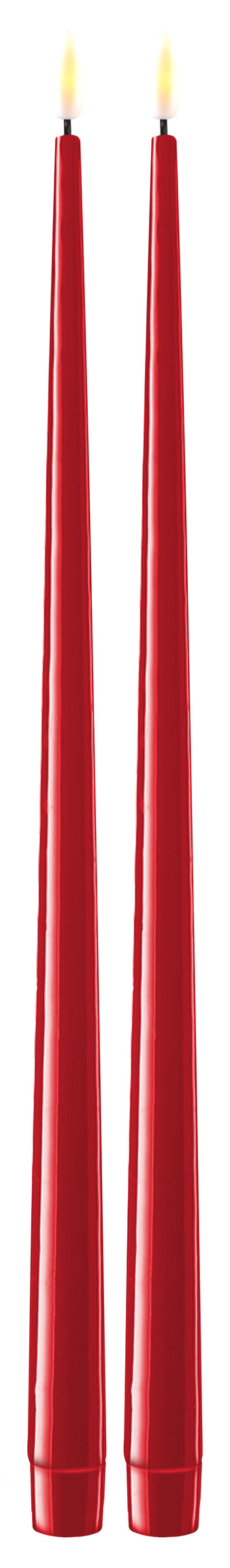 Dekorativa middagsljus LED 2-pack i en fin röd nyans, finns i flera olika storlekar & färger. LED-ljusen har en patenterad 3D Real Flame låga som ger ett verklighetstroget utseende, tillverkade av stearin med innerhölje i plast.