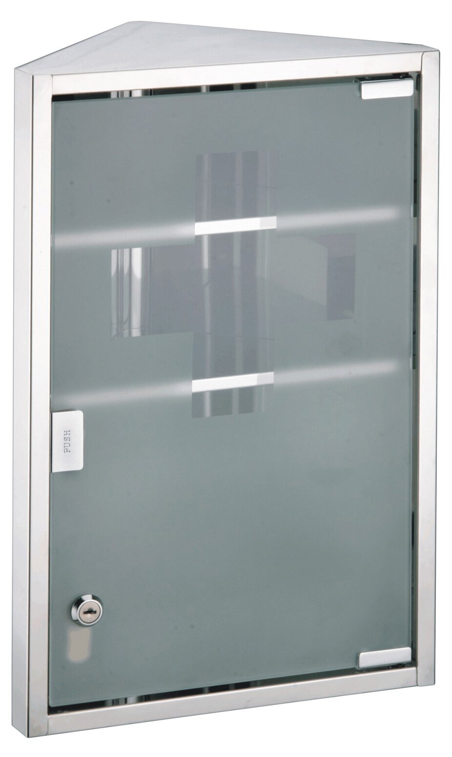 Bilden visar ett hörnskåp som ingår i Köpstaden.ses sortiment, märkt av varumärket Demerx. Detta hörnskåp är designat för att maximera användningen av annars outnyttjad hörnyta och är särskilt utformat för att förvara medicinska produkter. Skåpet har en robust rektangulär form med en front av frostat glas, vilket ger en skymd, men ändå delvis synlig översikt av innehållet. Det frostade glaset pryds av ett diskret stiliserat kors, vilket subtilt indikerar skåpets funktion som medicinsk förvaring.