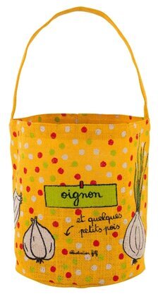 Designen framhäver motiv av lökar, stiliserade i enkla skisser med betoning på konturerna. Dessa lökar är placerade strategiskt runtom påsen, vilket ger ett tydligt visuellt tema. Text finns också med som en del av designen; ordet "oignon", det franska ordet för lök, är markerat i en grön ruta med en tillhörande text i svart, som står i kontrast mot den gula bakgrunden.