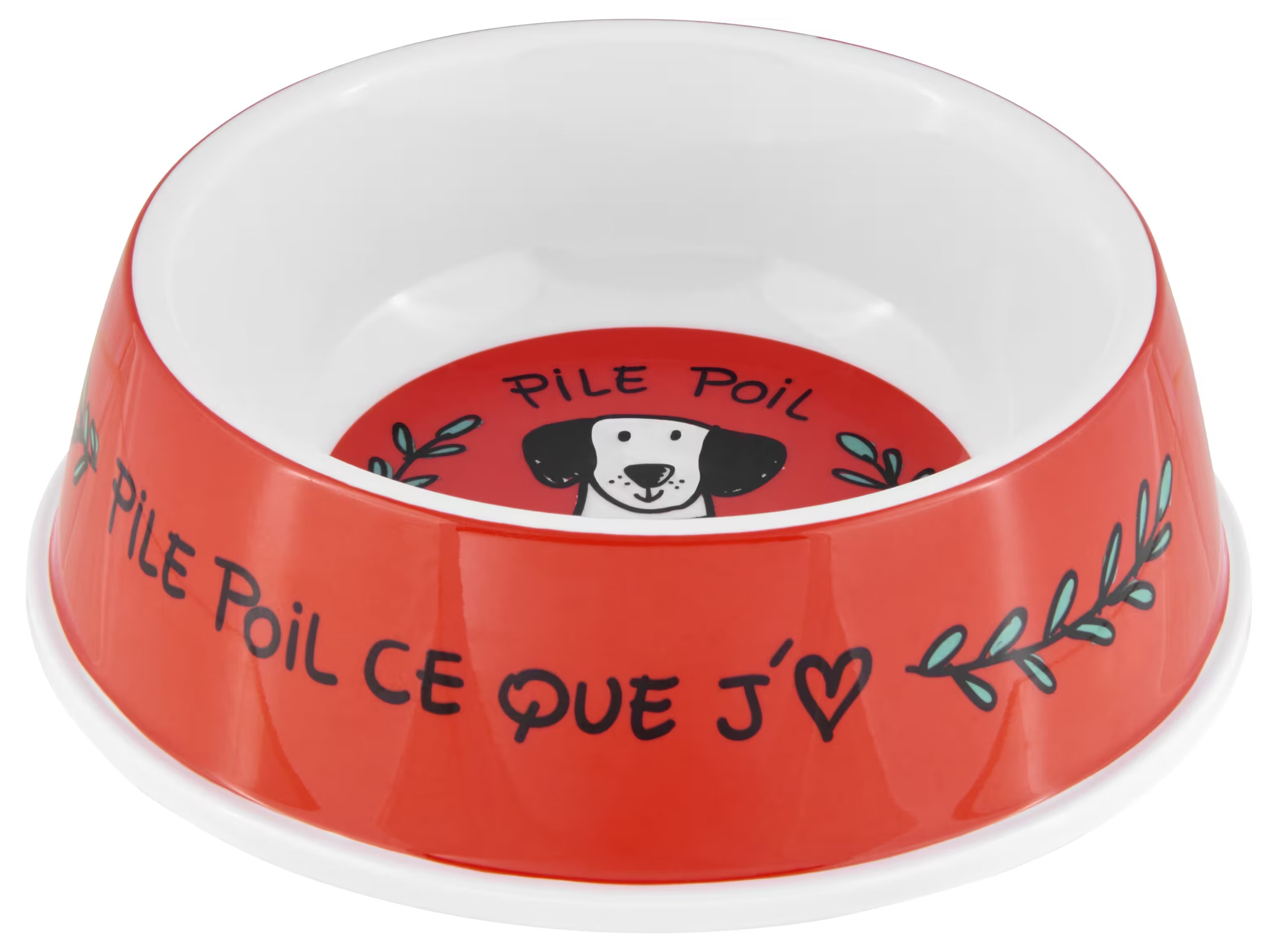 Inuti skålen hittar vi en illustration av en glad hund med stora, svarta öron och ett leende uttryck, vilket lägger till en lekfull touch till skålens design. Runt denna illustration finns orden "Pile Poil," placerad ovanför den glada hundens huvud. Den vita insidan av skålen utgör en neutral bakgrund som framhäver både text och bild, vilket skapar en harmonisk kontrast mot de livfulla färgerna.