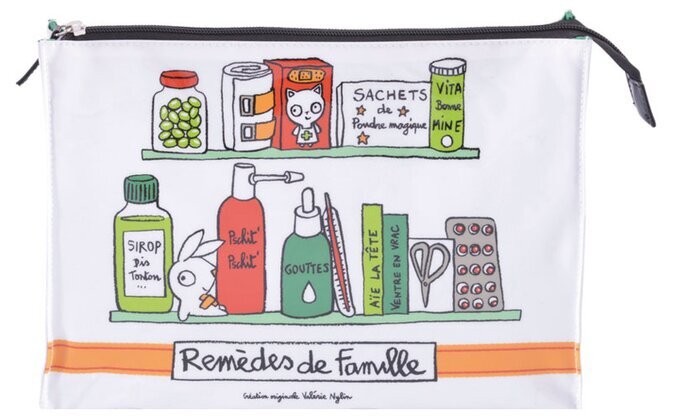 Den undre hyllan har liknande föremål, inklusive en sax och en karta med piller, vilket förstärker temat av en personlig apotekslösning för hemmet. I mitten av necessären finns texten "Remèdes de Famille", en fransk fras som översätts till familjens botemedel, och stärker temat av vardagliga lösningar på små hälsofrågor.