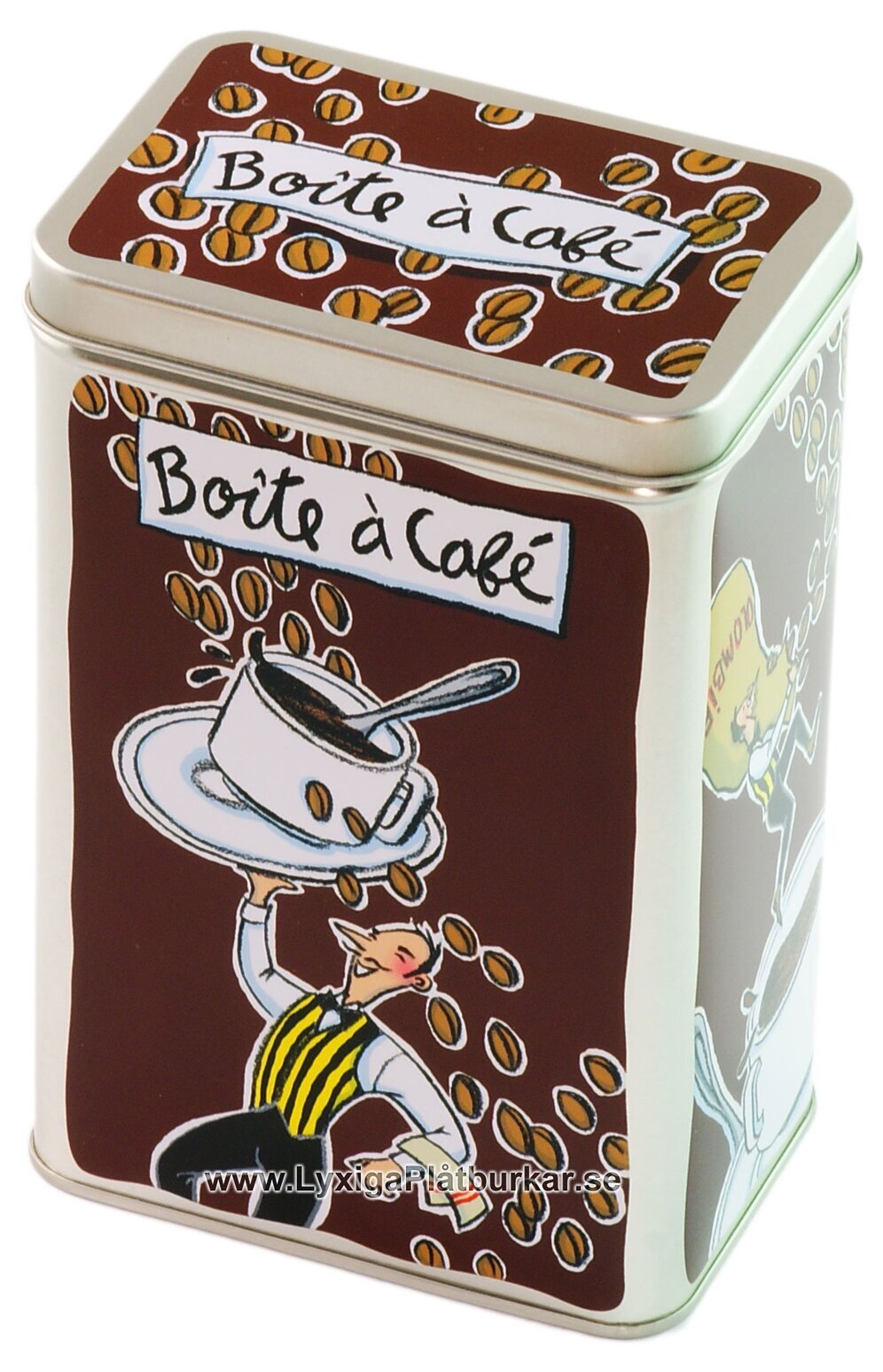 Överst på burken och längs sidan löper texten "Boîte à Café" i lekfull handstil. Denna text förstärker budskapet och syftet med plåtburken. Den vita bakgrunden av texten står i kontrast till de bruna tonerna och ger en tydlig, visuell fokuspunkt.
