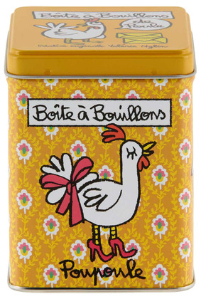 Dekorativ & färgglad plåtburk med lekfullt motiv till förvaring av hönsbuljong, från Derrière La Porte. Läs mer