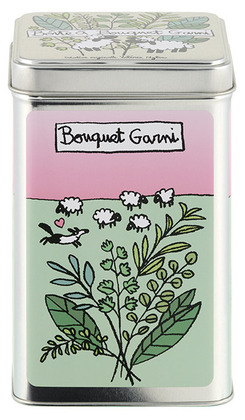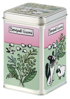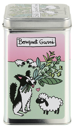 Ge dina torkade örter en charmig plats i köket. Denna färgglada plåtburk med texten "Bouquet Garni" pryds av ett lekfullt motiv med får, vallhund och blommande örter på en somrig äng. Perfekt för att förvara lagerblad, timjan, persilja eller andra favoritkryddor.