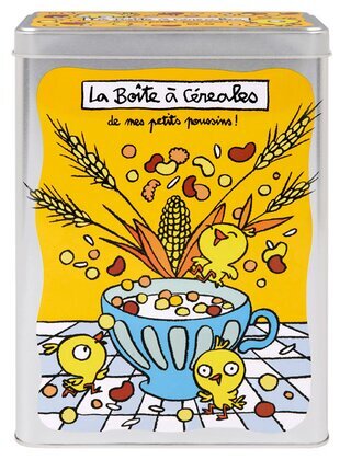 Plåtburk Flingor är en uppiggande behållare för förvaring av till exempel flingor eller müsli – något som kan göra även den mest morgontrötte på något bättre humör. Det lekfulla motivet med gul färg, kycklingar och sädeslag, kompletterat med fransk text, är utformat av märket Derrière La Porte / Dixie. Resultatet är en produkt som uppskattas av så väl barn som vuxna med sinnet för lekfullhet intakt.