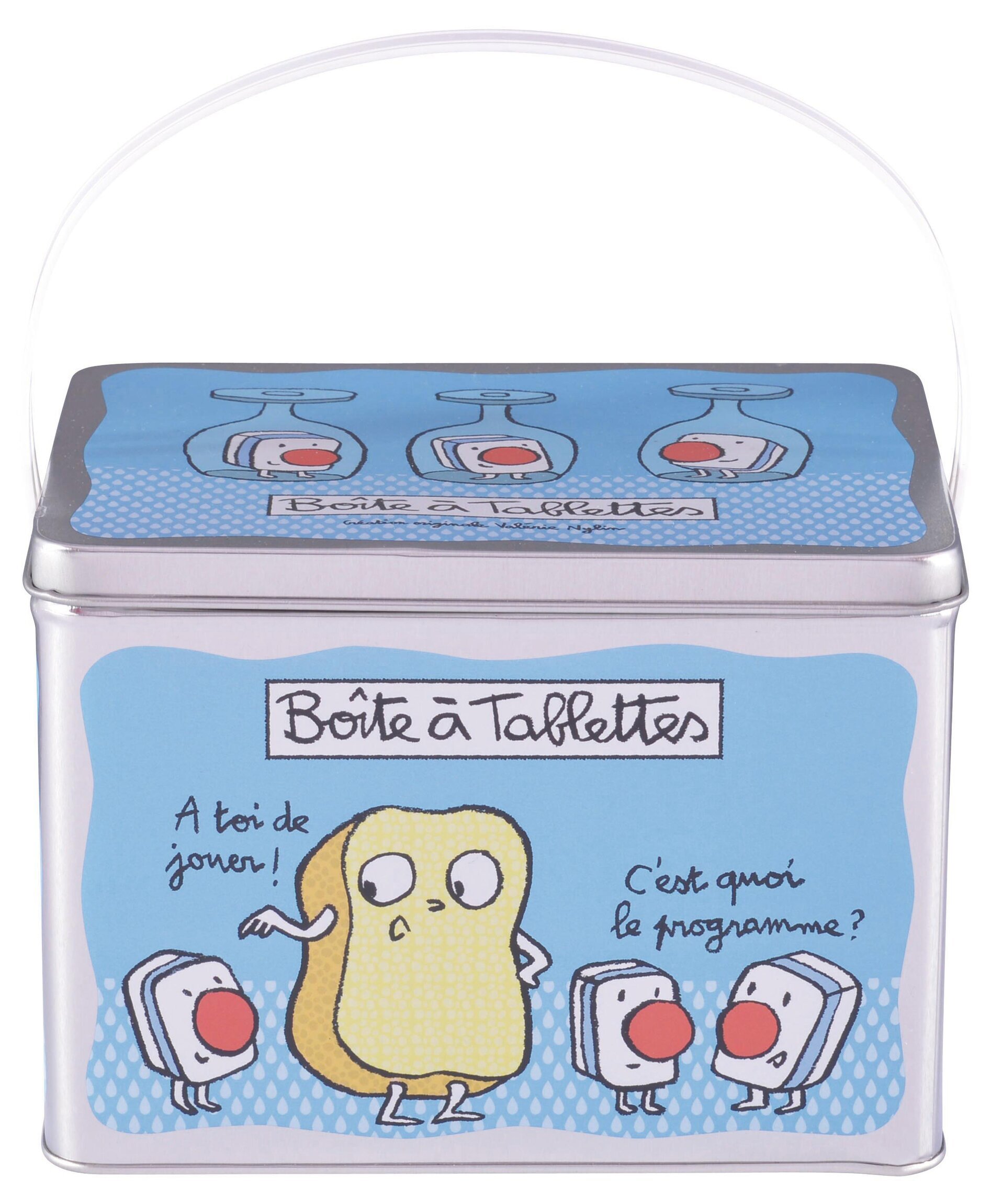 Bilden föreställer en plåtburk för maskindiskmedel från varumärket Derriére la porte, tillgänglig hos Köpstaden.se. Denna burk är designad för att förvara diskmedelstabletter och har en lekfull och fantasifull illustration på sin yta. På framsidan av burken ser vi en tecknad scen med en stor gul figur mitt i bilden, flankerad av två mindre vita figurer med räfflade kanter och röda cirklar på sina ytor. Dessa figurer föreställer humoristiskt diskmedelstabletter i konversation.