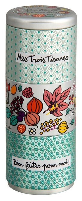 På burken finns också två handskrivna texter, som ger en personlig och hemtrevlig touch. Texten "Mes Trois Tisanes" är centrerad på den övre delen, vilket sannolikt syftar på de tre fack som burken erbjuder för att separera olika tesmaker. Den nedre texten "Bien faites pour moi!" förstärker intrycket av en personlig och omsorgsfull produkt. Bokstäverna har ett avslappnat, men ändå tydligt utseende som harmoniserar med de färgstarka teckningarna.