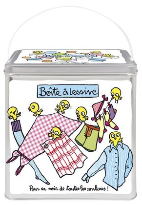 Ovanför motivet finns texten "Boîte à lessive" som förstärker burkens syfte. Teckensnittet på texten är lekfullt och passar in i den humoristiska stilen. Längst ner på burken finns ytterligare en liten text på franska, vilket bidrar till den kosmopolitiska känslan och kan tilltala den designmedvetna konsumenten.