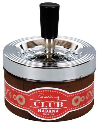 Bilden visar en askkopp från Köpstaden.se, en butik med ett rikligt utbud av produkter för alla delar av vardagen. Denna specifika askkopp är en del av Derriére la portes sortiment och har en retroinspirerad design. Askkoppen pryds av en bred, röd etikett som sträcker sig runt dess mitt och bär texten "Smoking Club Habana" i ett vitt typsnitt. Etiketten är detaljerad med symmetriska mönster i vitt och beigerosa nyanser, vilket förstärker dess vintagekänsla.