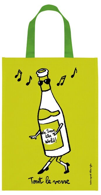 Inuti flaskans etikettdel finns texten “We Save the World!” skriven i ett handritat typsnitt, vilket förstärker dess informella och tilltalande stil. Nedanför flaskan finns texten “Tout le verre” som betyder “Allt glas”, vilket förmedlar återvinningstemat.