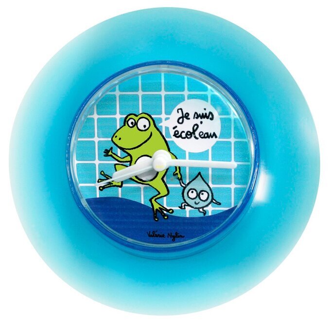 Den omgivande ramen av klockan är tillverkad i ett glansigt, blått material som ger ett fräscht och rent intryck, vilket är passande för ett badrum. Inuti ringen ser vi en illustration med ett rutmönstrat kakelmotiv i bakgrunden, vilket förstärker känslan av att befinna sig i ett badrum. Mot den blåaktiga bakgrunden syns en grön tecknad groda med stora, uttrycksfulla ögon som står på ett av sina bakben. Vid dess sida finns en liten, droppformad figur som verkar följa med i grodans rörelser.