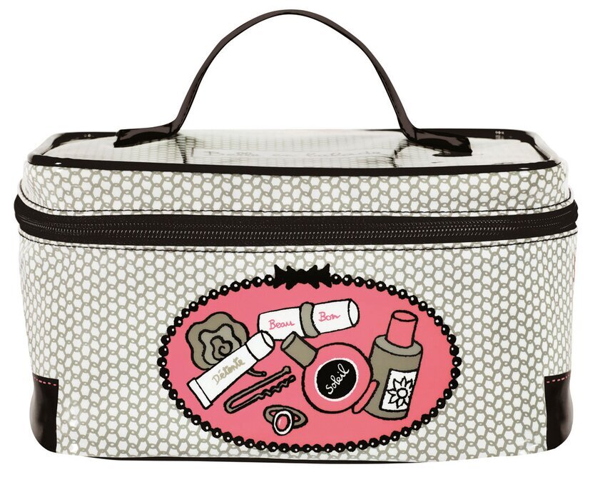 Ett av de mest framträdande designelementen är den dekorativa ovala panelen på väskans framsida. Mot en bakgrund av stark rosa framträder stiliserade illustrationer av kosmetikaprodukter, som överläppstift och parfymflaskor, kompletterade med ord som Beau och Bon. Denna konstnärliga touch från Derriére la porte ger ett kreativt och lekfullt uttryck till den funktionella skönhetsboxen. Runt kanten av den ovala figuren löper en svart, prickig ram som lyfter hela motivet.