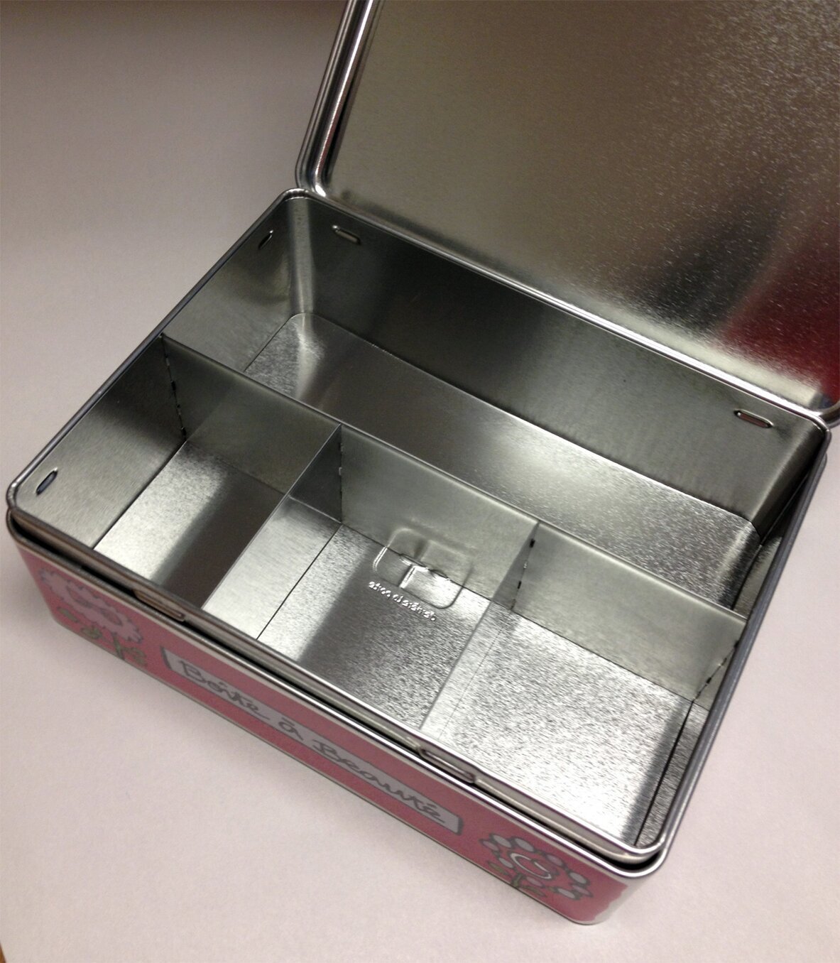 Inuti är boxen uppdelad i flera sektioner, med vertikala och horisontella skott som skapar fack i olika storlekar. Dessa fack är användbara för att sortera och förvara diverse småartiklar, vilket gör det till en idealisk lösning för att hålla ordning på smink, smycken eller andra små föremål. Metallen har en blank finish som fångar ljuset och gör att innehållet blir lätt att se vid öppning.