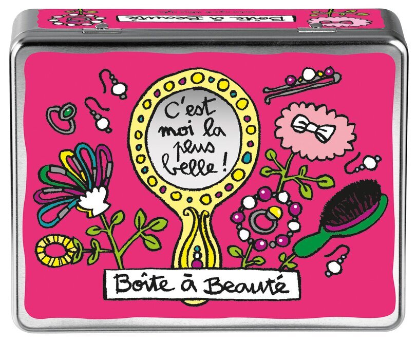 Plåtburk Beautybox är en behållare speciellt utformad för förvaring av skönhetsattiraljer, så som speglar, borstar, klämmor, band, smink och dylikt, med en mycket elegant men lättsam design från märket Derrière La Porte / Dixie. Motivet med diverse relaterade objekt på en rosa bakgrund kompletteras av fransk text.