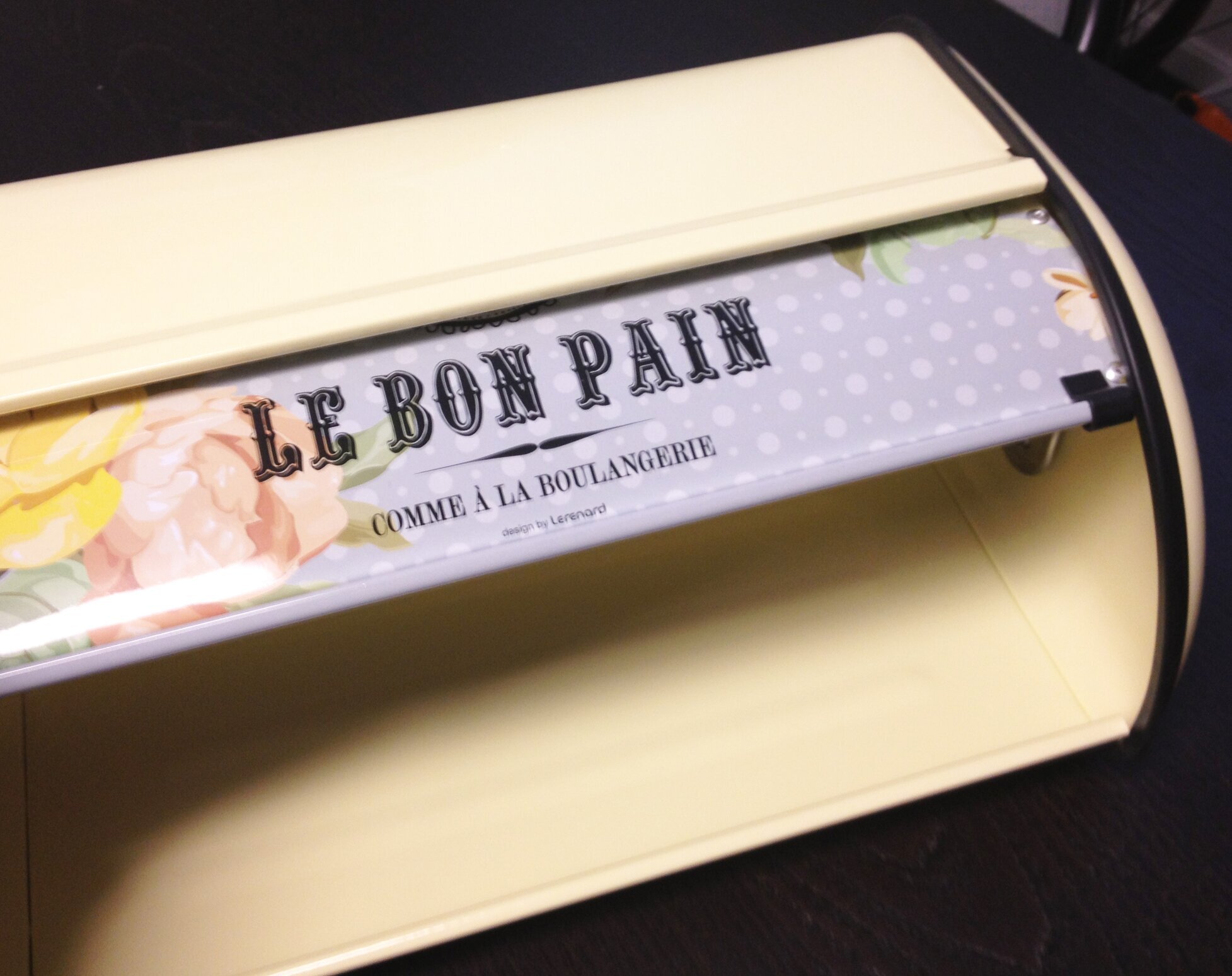 Lantligt gul brödbox i plåt med texten "Le bon pain" som betyder "Gott bröd". Smidig lucka som man bara drar uppåt för att öppna brödboxen.