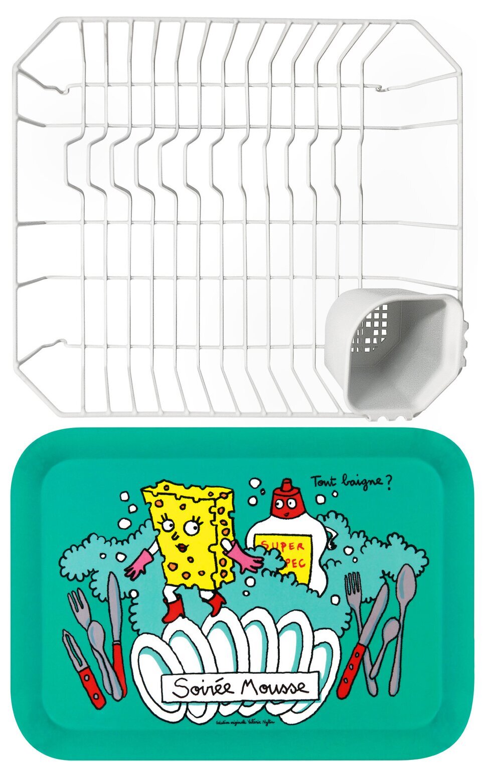 Diskställ från märket Derrière La Porte / Dixie är en produkt som gör köket lite trevligare. Den bär en design som är typisk för märket: lekfull men ändå elegant med fransk text, i detta fall ett motiv inspirerat av tecknad film mot en turkosblå bakgrund. Den passar också perfekts ihop med Diskmedelspump Blå i vårt sortiment, och andra produkter från samma märke så som behållare för olika livsmedel kan skapa en enhetlig och skön känsla i köket. Avrinningsbrickans mått är 38,5 x 28 centimeter, vilket är en lagom storlek som passar in på diskbänkars avsedda utrymmen, samtidigt som gott om disk ryms i stället. Materialen som används i produkten är plasten melamin och metall.