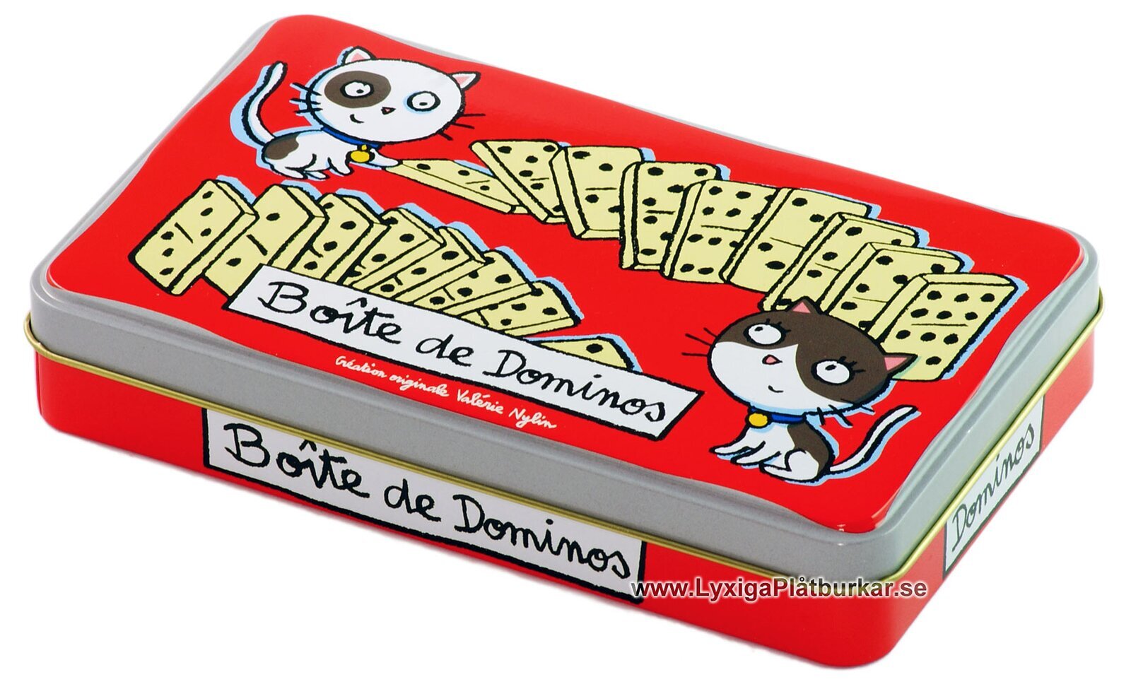 Dessa glada katter är placerade så att de ramar in en rad dominos, vilket skapar en känsla av rörelse och dynamik. Dominobrickorna, tecknade i blekgula toner med svarta prickar, formar en huvuddel av designen och ger en intressant kontrast mot den röda bakgrunden. Det franska textstycket ”Boîte de Dominos” står skrivet i svart på vitt, placerat centralt på burken, vilket ger ytterligare stil och elegans till dess utseende.