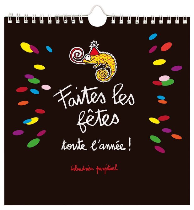 Texten "Faites les fêtes toute l’année!" är skriven med ett stiliserat, handskrivet typsnitt mitt på bilden, vilket innebär "Fira året runt!" på svenska. Budskapet förstärker produktens syfte att hjälpa användaren komma ihåg viktiga dagar året om. Under huvudtexten står det med mindre röd text "calendrier perpétuel", vilket betyder "evighetskalender".