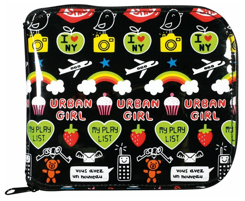 Väskans yttre kännetecknas av en livfull och ungdomlig grafik på en svart bakgrund. Mönstren inkluderar diverse symboler som uttrycker urban livsstil och populärkultur. Vi ser upprepade motiv med texten "Urban Girl" i en lekfull, röd teckensnitt, omgiven av symboler som vita flygplan, färgglada regnbågar och fluffiga vita moln. Dessa element ger en känsla av rörelse och energi.