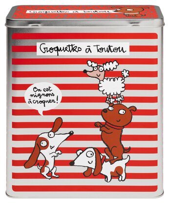 Det finns även text på framsidan av burken som lyder "Croquettes à toutou", vilket indikerar att den är avsedd för förvaring av hundmat eller andra hundtillbehör. En pratbubbla visar en fransk text som säger "On est mignons à croquer!" vilket ytterligare förstärker den lekfulla tonen i designen.