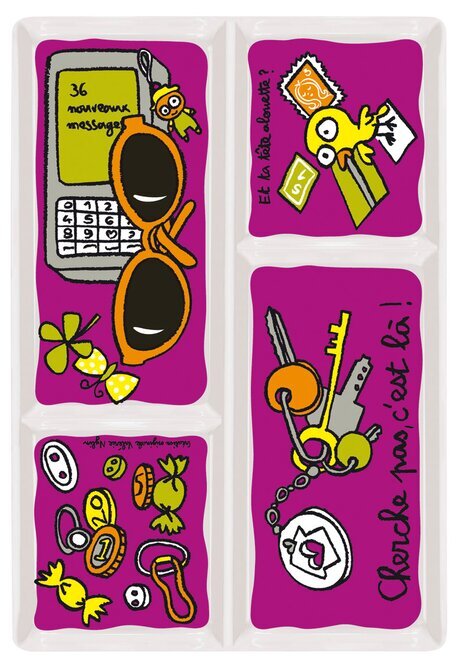 Bilden från Köpstaden.se visar ett unikt keramikfat med flera fack, designat av varumärket Derrière la porte. Färgerna på fatet är levande och iögonfallande, med en stark lila bakgrund som förstärker de illustrerade detaljerna. Fatet är rektangulärt och uppdelat i fyra separata avdelningar, var och en med sitt eget charmiga motiv.