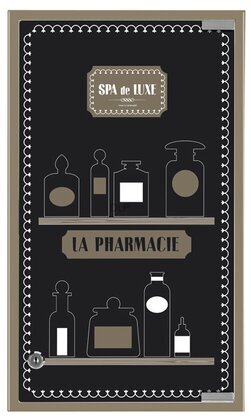 Bilden visar framsidan av ett medicinskåp från butiken Köpstaden.se, tillverkat under varumärket Derriére la porte. Detta medicinskåp, med namnet Spa de luxe, har en stilren och funktionell design. Framsidan av skåpet domineras av en mörk färgpalett med en svart bakgrund. På detta finns olika silhuetter av flaskor och burkar avbildade i vitt och beige, vilket ger en elegant kontrast och en känsla av ordning och struktur.