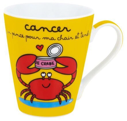 På bilden ser vi en livfullt designad mugg från det franska varumärket Derriére la porte, specifikt produkten Mugg Kräfta. Denna mugg är en del av Köpstaden.se:s breda utbud och kännetecknas av sin färgglada och humoristiska stil. Muggen domineras av en lysande gul bakgrund som ger ett glatt och inbjudande intryck. På framsidan av muggen står en tecknad röd kräfta med sina klor upphöjda, som om den håller i något.