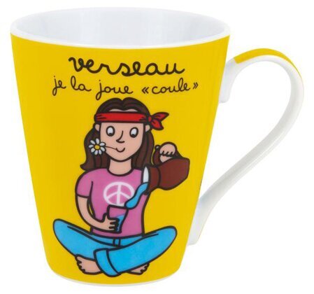 Bilden visar en mugg från produkten Mugg Vattuman, skapad av varumärket Derriére la porte, och tillgänglig hos Köpstaden.se. Muggen är livfull och färgglad, med en klar gul bakgrund som fångar ögat. På framsidan finns en illustration av en tecknad figur i avslappnad meditation. Figuren bär en röd pannband och en rosa tröja prydd med ett fredstecken, vilket framhäver en känsla av lugn och balans.