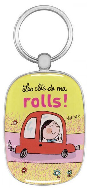 Texten ”Les clés de ma rolls!” står högst upp i den gula delen av nyckelringen. Orden är skrivna med en lekfull typografi, där ordet "rolls" är markerat med en djärv rosa färg. Detta skapar direkt uppmärksamhet och tillför en humoristisk ton till hela designen.