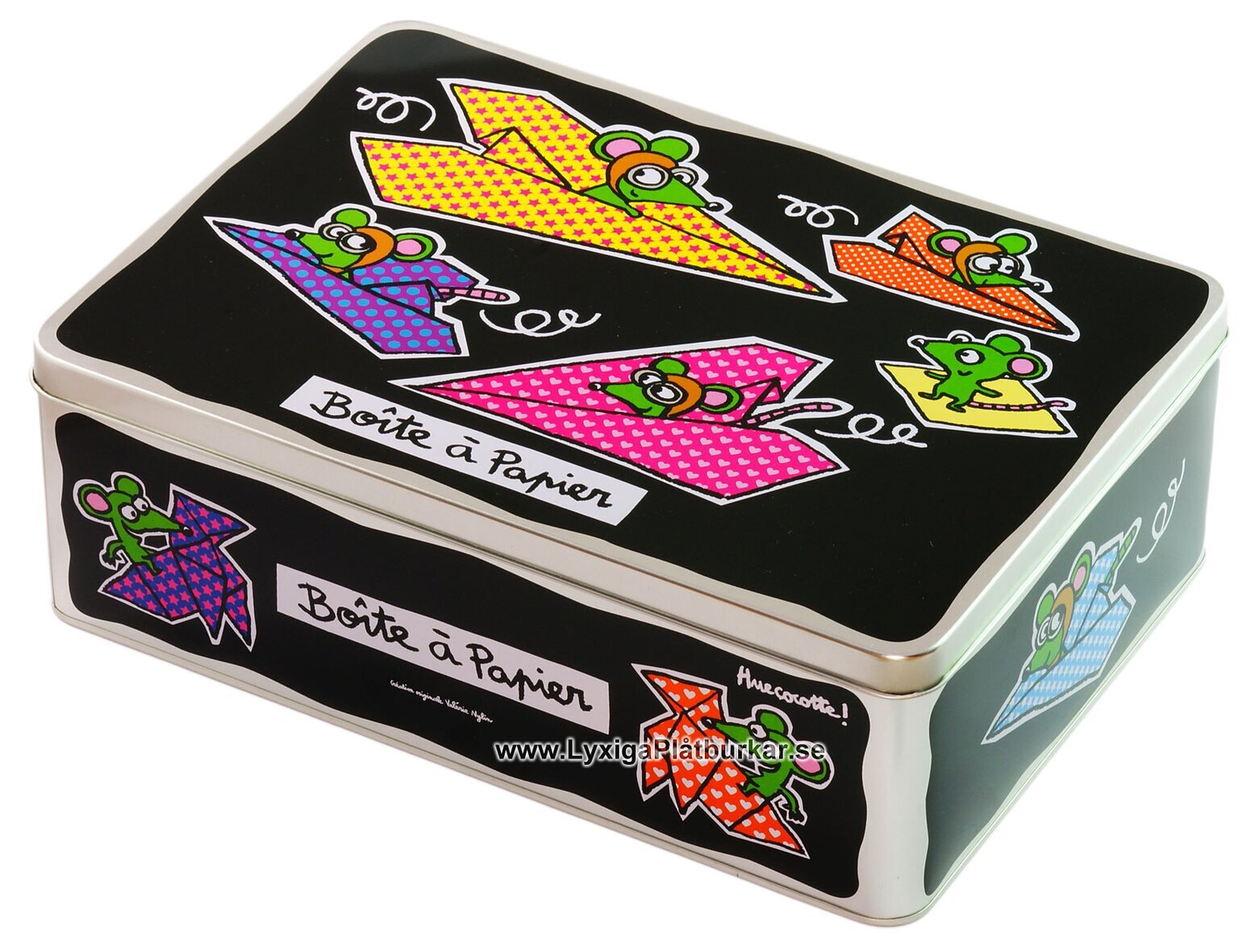 Denna bild visar en plåtburk med namnet Plåtburk Papper svart från varumärket Derrière la porte, som finns tillgänglig hos Köpstaden.se. Burken kännetecknas av sitt färgglada och lekfulla motiv mot en svart botten. Omslaget pryds av tecknade möss som flyger på olika origamiflygplan. Varje flygplan är unikt mönstrat och färglagt i livfulla nyanser av gult, rosa, blått och orange, täckta med olika former och mönster såsom prickar och hjärtan.