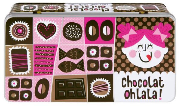 Ett framträdande inslag i burkens design är den stiliserade illustration av ett glatt ansikte. Ansiktet är placerat i det nedre högra hörnet och är omgivet av en bakgrund med bruna prickar. Det har rosa hår och rosetter, vilket ger en lekfull och humoristisk touch. Intill ansiktet står texten "chocolat ohlala!" i fet stil, vilket förstärker det kärleksfulla temat kring choklad.