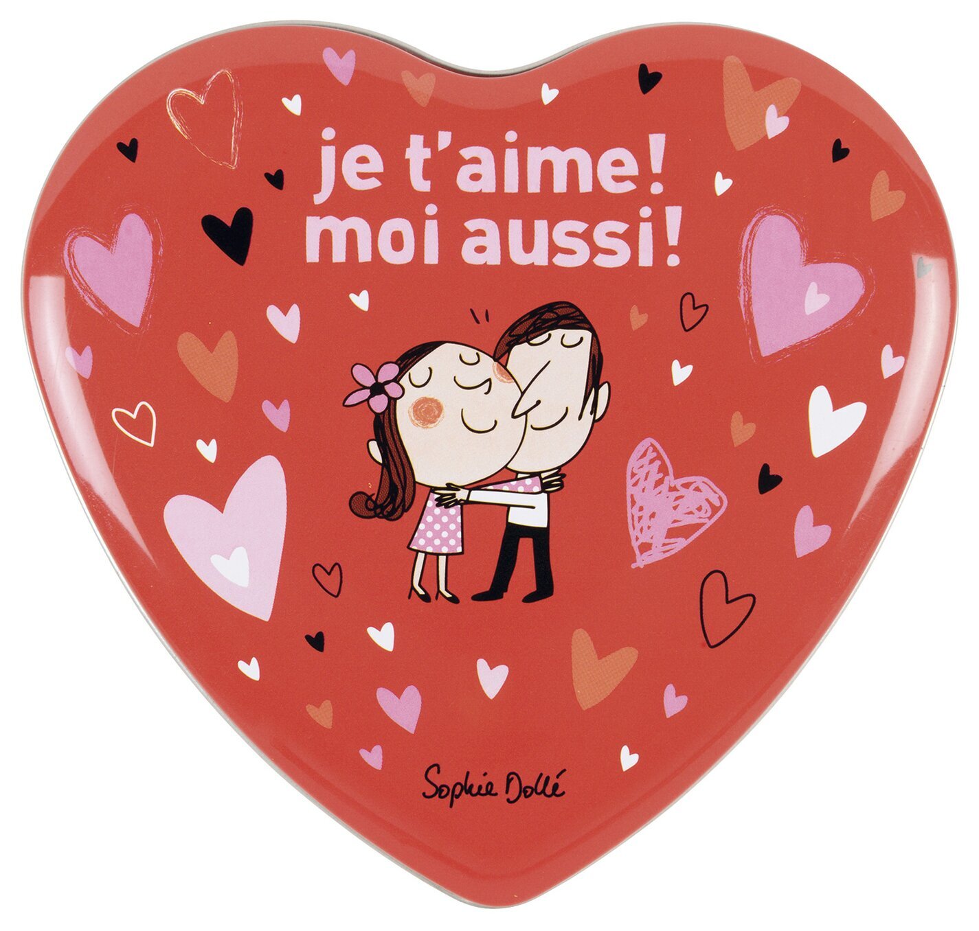 Ovanför paret finns texten "je t’aime! moi aussi!", skrivet i djärv, vit stil som tydligt står ut mot den rosaröda bakgrunden. Texten förstärker budskapet om kärlek och ömhet, vilket är centralt för designen. Runt omkring paret och texten finns en mängd hjärtformer i olika storlekar och färger, inklusive rosa, vitt, svart och olika nyanser av rött. Dessa hjärtan är spridda jämnt över ytan och bidrar till en visuell dynamik som fångar ögat.