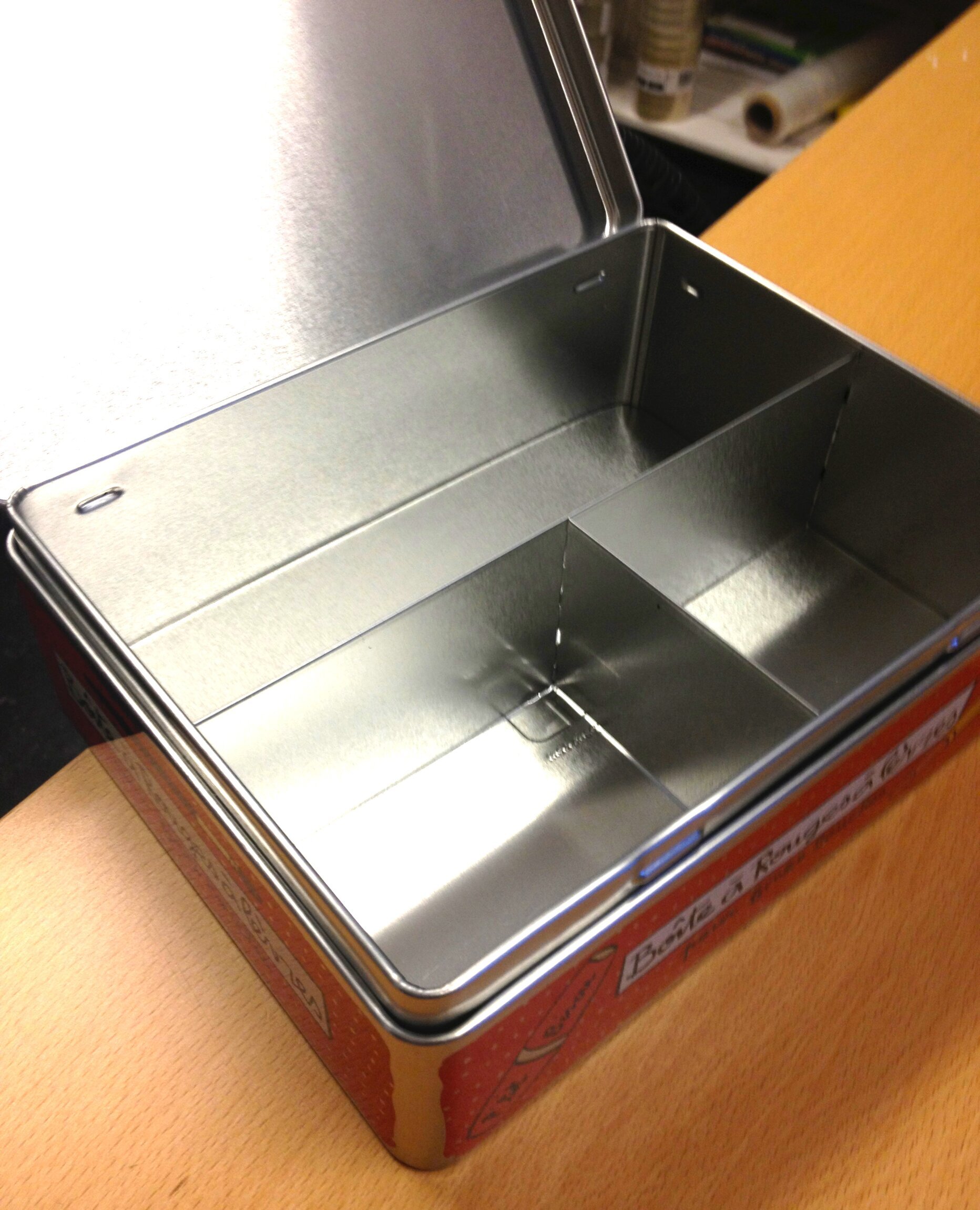Plåtburken är rektangulär och har en robust metallkonstruktion som erbjuder både hållbarhet och funktionalitet. Locket är fäst på ena sidan och kan enkelt öppnas och stängas, vilket skyddar innehållet från damm och andra yttre element. På insidan är burken indelad i flera sektioner, vilket gör det möjligt att effektivt separera och organisera olika föremål. Indelningen är jämnt fördelad med metallpaneler, vilket bidrar till en strukturerad och lättillgänglig förvaring.