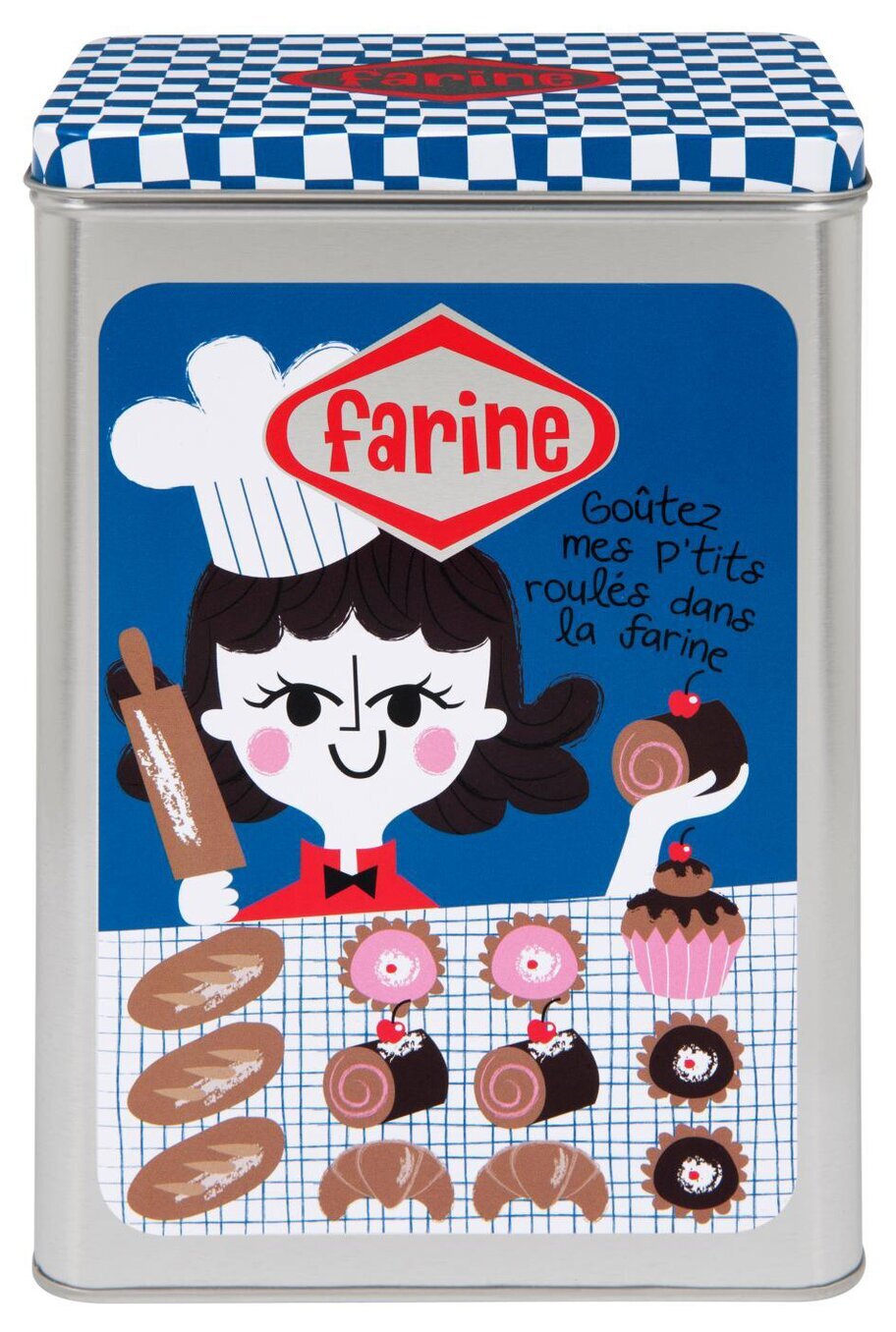 Bakgrunden är blå med ett tydligt retroinspirerat mönster som ger burken ett charmigt nostalgiskt utseende. På locket ser man ett rutigt mönster i blått och vitt som förstärker den retro känslan. Texten "farine", vilket är franska för mjöl, står i centrum i ett rött emblem. Denna detalj signalerar tydligt vad burken kan användas till – perfekt för förvaring av mjöl eller andra torra ingredienser i köket.
