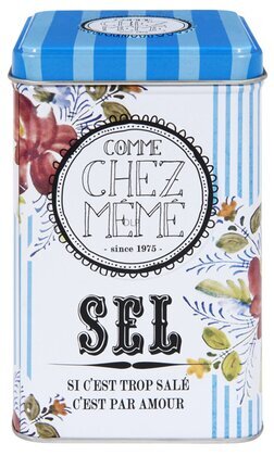 Materialet i plåtburken antyder en hållbar och solid konstruktion, ideal för att förvara salt på ett säkert och stilfullt sätt. Dess relativt kompakta storlek och smarta design gör den både praktisk och dekorativ i köket, där den kan stå framme som en både funktionell och estetiskt tilltalande del av inredningen.