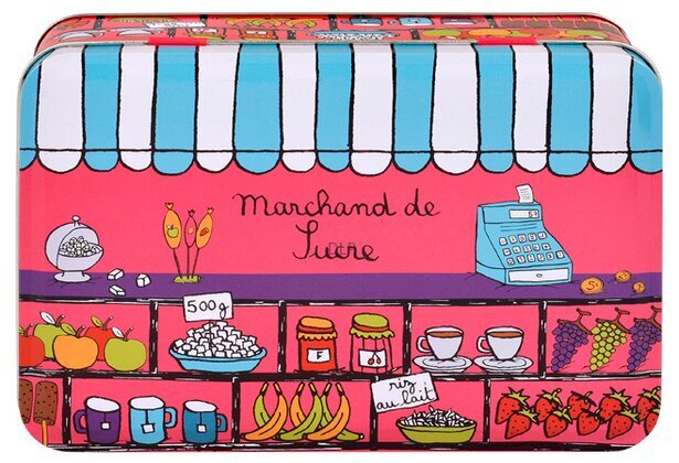 Denna plåtburk från varumärket Derrière la porte, som finns hos butiken Köpstaden.se, ger en nostalgisk känsla av en klassisk marknad. Burken illustrerar en charmig marknadsståndscen och är livfullt dekorerad med olika färger och detaljer som livar upp varje kökshylla.