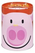 Bilden visar en lekfull och charmig plåtburk formad som en sparbössa, särskilt designad för barn och vuxna som älskar kreativ design. Plåtburken har en iögonfallande grisdesign med ett stort, leende ansikte på framsidan. Grisen är mjukt rosa med två stora, runda kinder i en något mörkare nyans av rosa. Mitt i ansiktet finns en liten, enkel näsa som pryder burken och förstärker dess charmiga uttryck.
