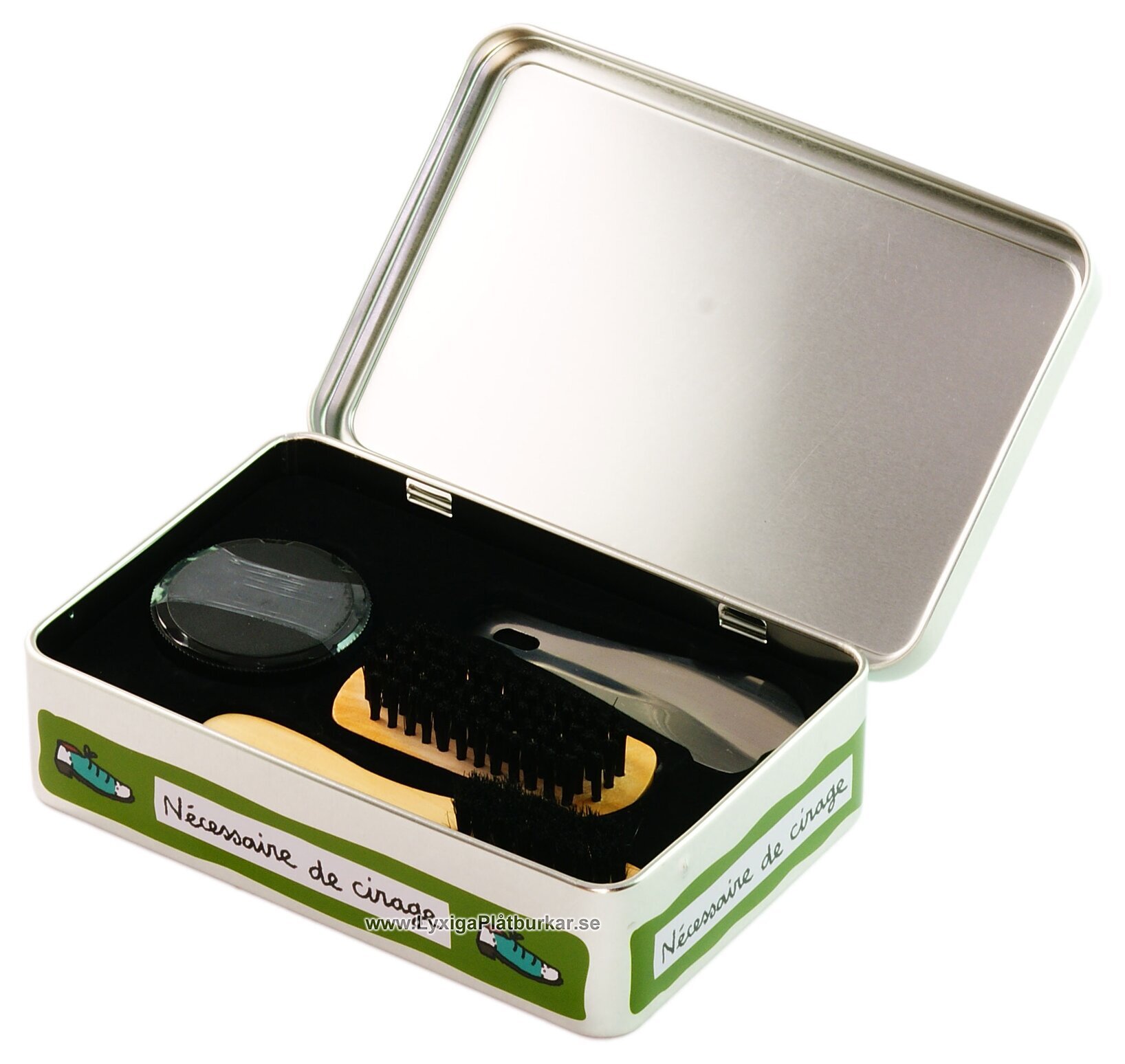 Ytterligare en detalj inuti burken är en liten, silverfärgad skohorn, som adderar både funktionalitet och värde till kitet. Skohornets kompakta storlek gör det lätt att förvara och transportera, vilket förstärker plåtburkens roll som en praktisk uppbevaringslösning.