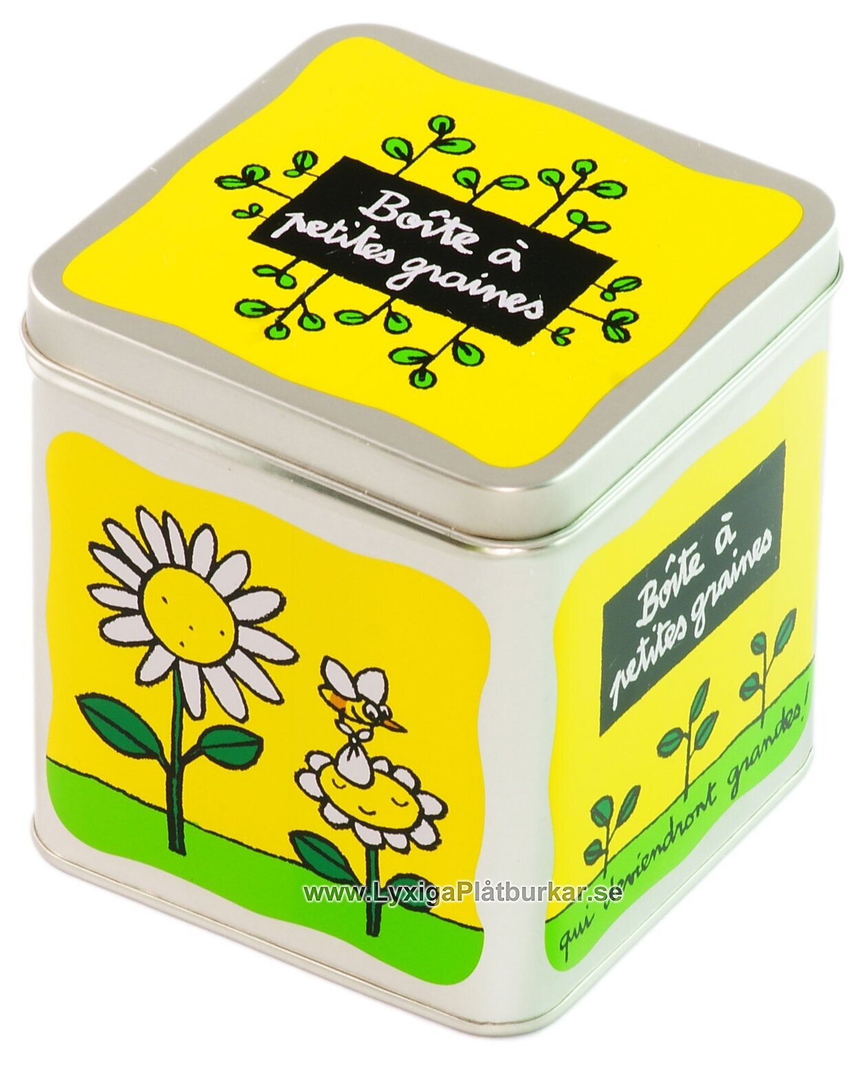 Den fyrkantiga lådan har en distinkt gul bakgrund som täcker alla sidor, och detta ljusa färgval bidrar till en lite nostalgisk känsla. På locket och sidorna av lådan finns franskspråkig text med orden "Boîte à petites graines", vilket betyder fröbox, i handskrivet typsnitt som ger en hemtrevlig och personlig touch. Texten är placerad i en svart rektangel, omgiven av enkla gröna bladdetaljer, vilket förstärker det naturliga temat.