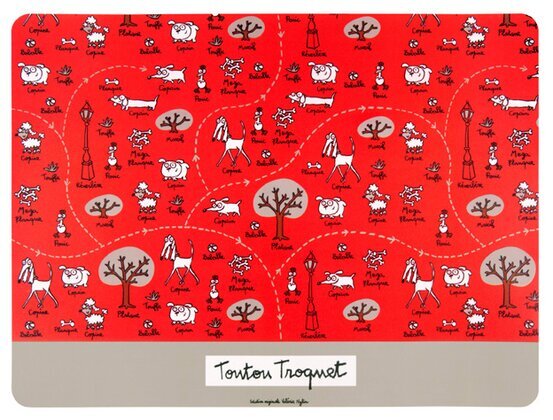 Bilden från Köpstaden.se visar ett underlägg för hundskålar från varumärket Derriére la porte. Den framstår som en kvadratisk produkt med en iögonfallande röd färg i bakgrunden, där en mängd tecknade figurer och mönster täcker ytan. Illustrationerna inkluderar både hundar och får i en lekfull stil, vilket ger en humoristisk och livlig touch till underlägget.